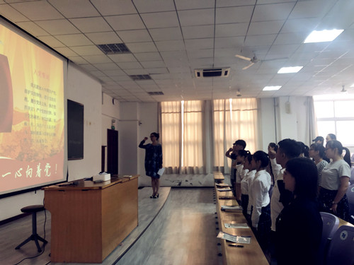 大会第二阶段,主要讨论接收徐思雨等4位同志为预备党员的问题。发展对象逐一宣读《入党志愿书》,并向党组织汇报自身对党的认识、入党动机、个人经历以及在校表现等,表达了对党的向往、忠诚和坚定不移跟党走的决心。然后由入党培养人对其学习、工作和生活等方面发表意见,按照组织程序,党支部培养联系人汇报了发展对象的基本情况和考察意见。经全体党员讨论表决,一致同意吸收徐思雨等4位同志为中共预备党员。老党员教师现场为新党员佩戴党徽,吴书记带领全体党员面向党旗进行庄严宣誓。