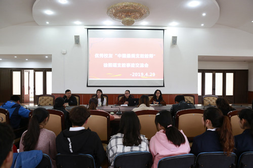 4月29日下午,学工处邀请音乐舞蹈系2016届优秀员工徐熙瑶在洞山校区第二会议室举办了支教事迹交流会。学工处、各院系师生代表参加了会议,会议由学工处副处长陈繁主持。