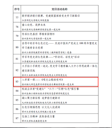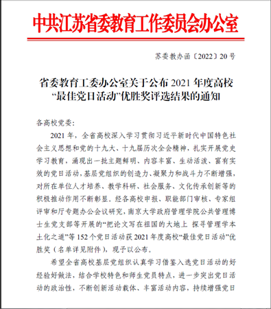近日,在2021年度江苏省高校“最佳党日活动”评选中,谈球吧第一党支部党日活动“入学第一课——《唱支山歌给党听》”获优胜奖。